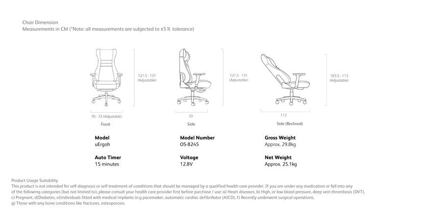This product is not intended for self-diagnosis or self-treatment of conditions that should be managed by a qualified health care provider. If you are under any medication or fall into any of the following categories (but not limited to), please consult your health care provider first before purchase / use: a) Heart diseases, b) High, or low blood pressure, deep vein thrombosis (DVT), c) Pregnant, d) Diabetes, e) Individuals fitted with medical implants (e.g pacemaker, automatic cardiac defibrillator (AICD), f) Recently underwent surgical operations, g) Those with any bone conditions like fractures, osteoporosis.