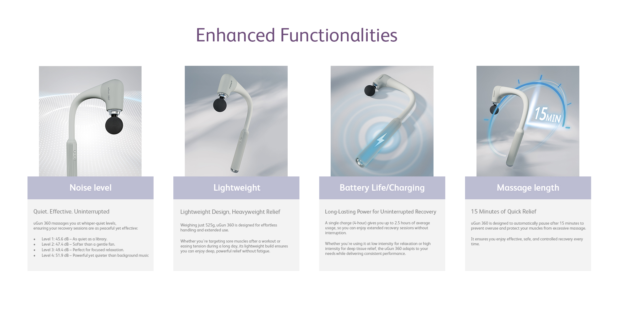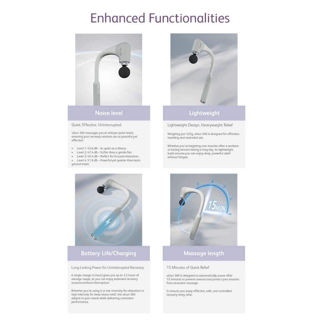 uGun 360 is designed to automatically pause after 15 minutes to prevent overuse and protect your muscles from excessive massage. It ensures you enjoy effective, safe, and controlled recovery every time.