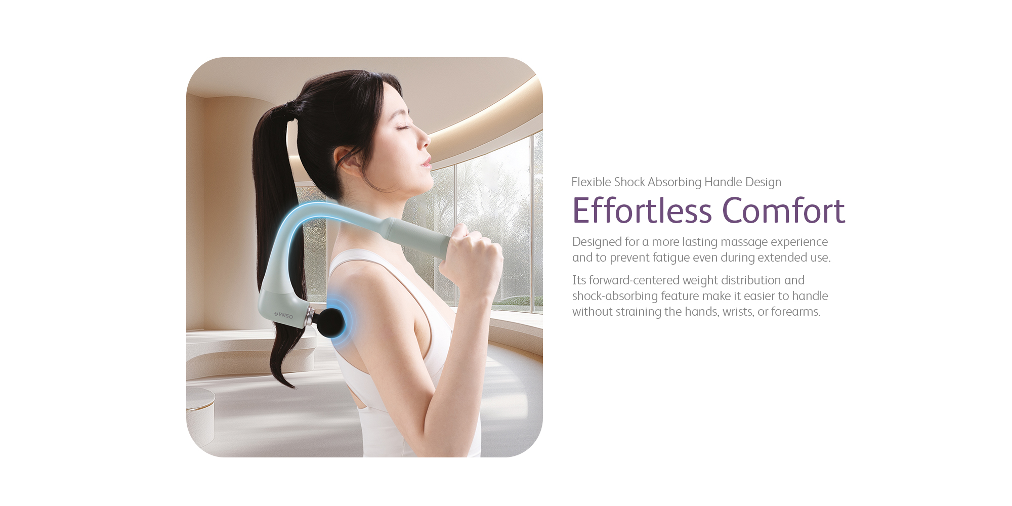 Designed for a more lasting massage experience and to prevent fatigue even during extended use. its forward-centered weight distribution and shock-absorbing feature make it easier to handle without straining the hands, wrists, or forearms.