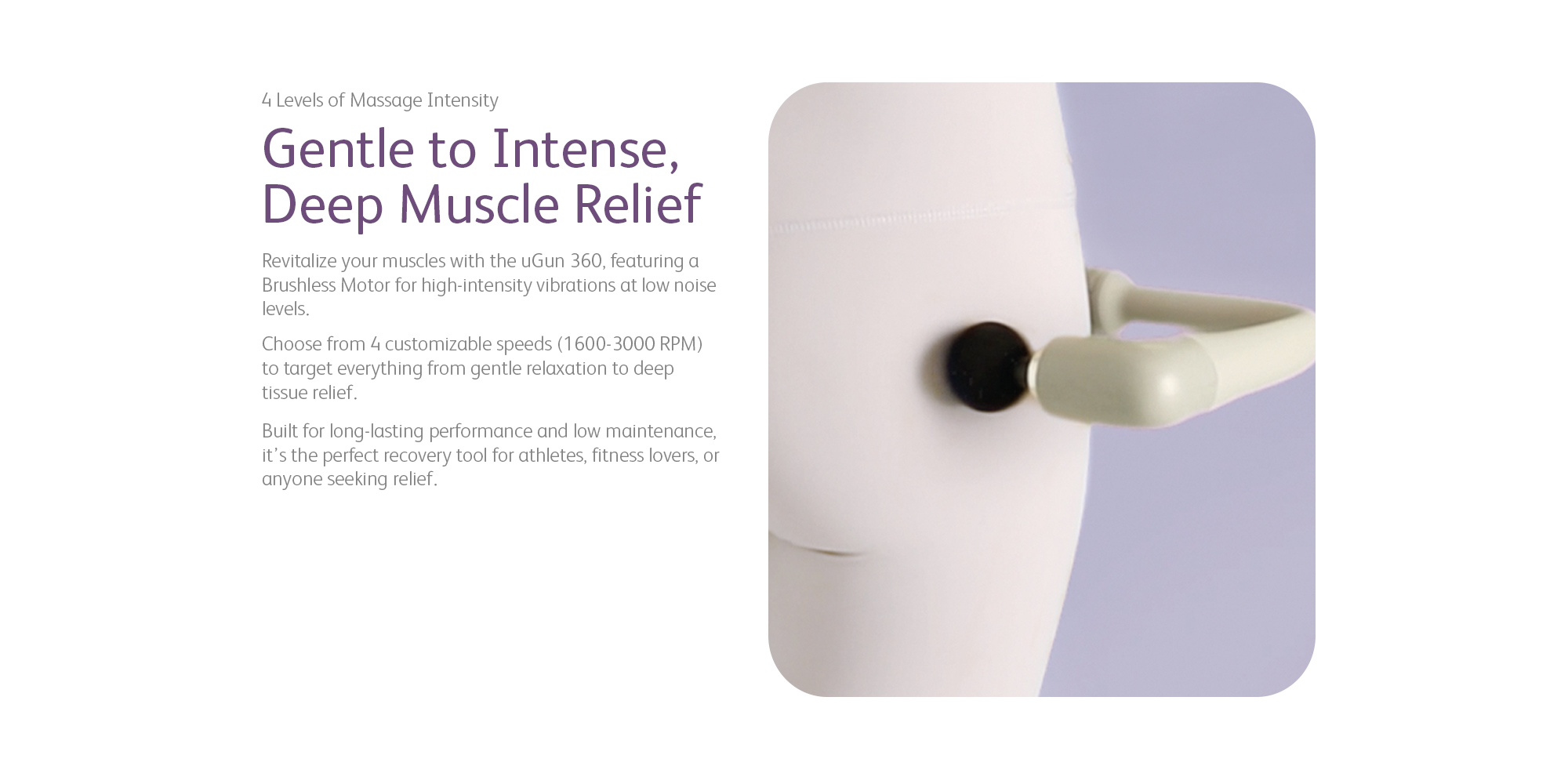 Whether you’re using it at low intensity for relaxation or high intensity for deep tissue relief, the uGun 360 adapts to your needs while delivering consistent performance.