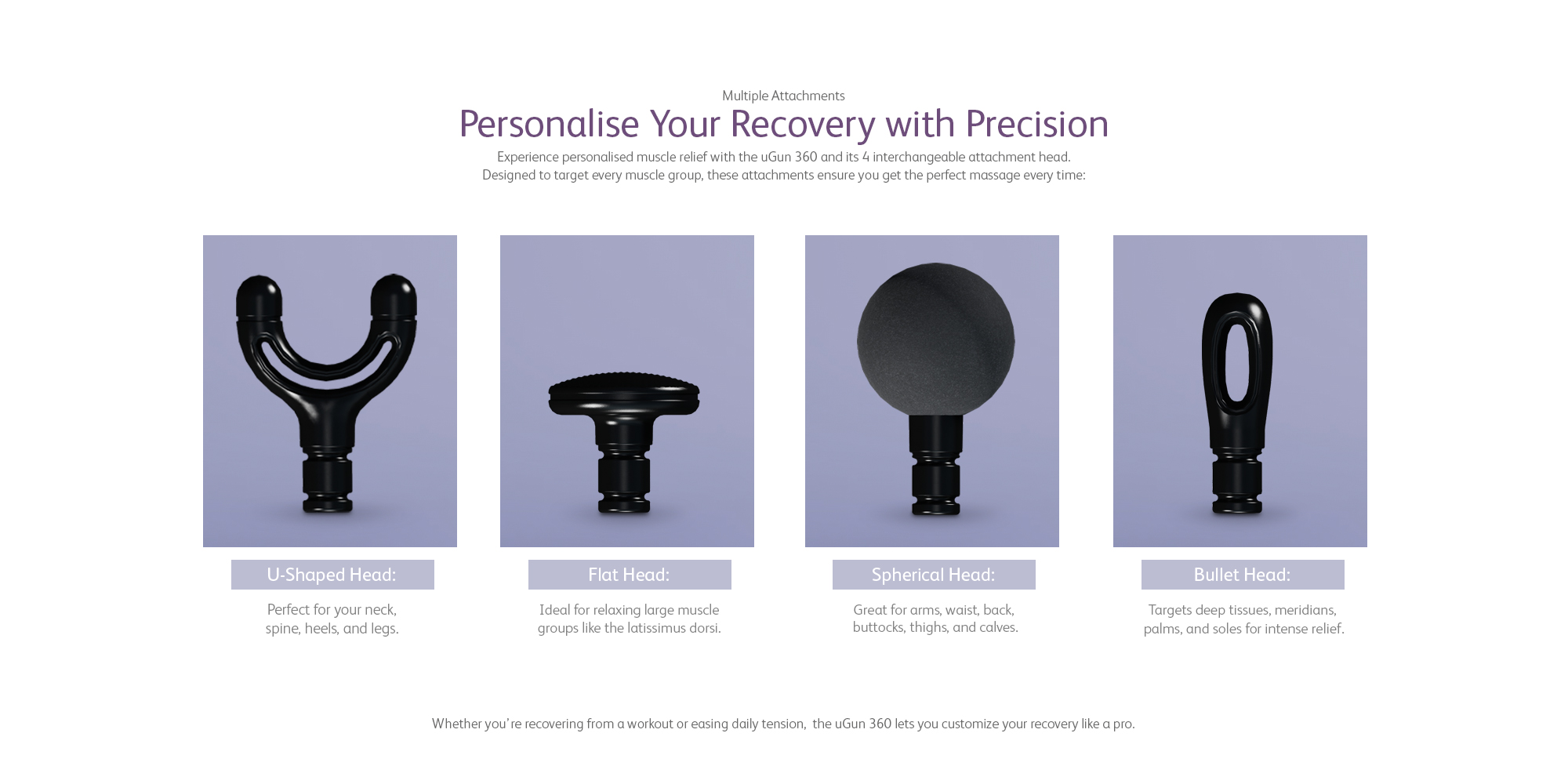 Experience personalised muscle relief with the uGun 360 and its 4 interchangeable attachment head. Designed to target every muscle group, these attachments ensure you get the perfect massage every time: